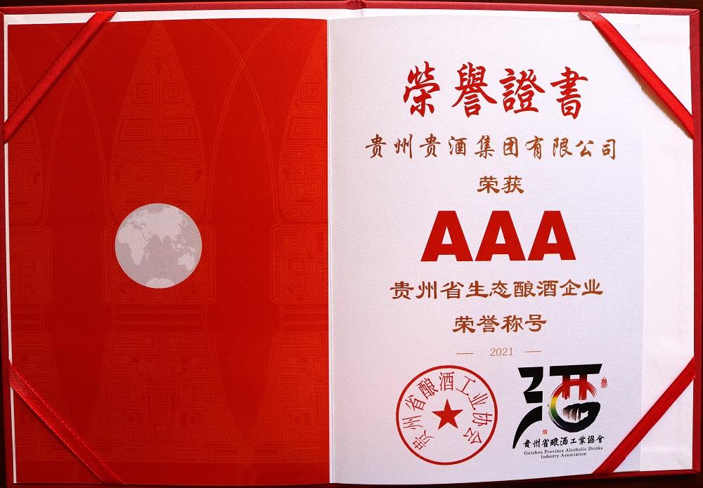 贵酒集团荣获3A级贵州省首届“生态酿酒企业”荣誉